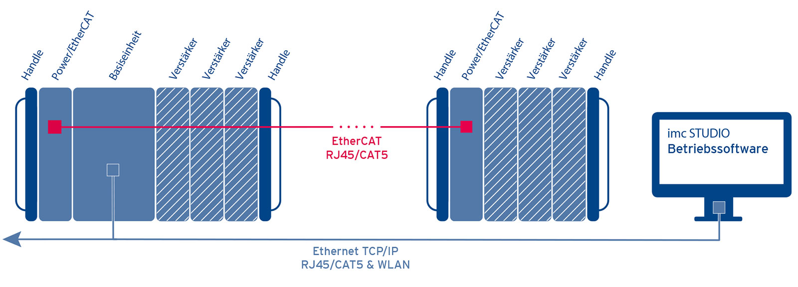 Neben dem modularen Aufbau als zentrales DAQ-System, lässt sich imc CRONOS-XT auch räumlich verteilt einsetzen. So können Messverstärker nahe der Messstelle platziert werden, um die empfindlichen und teuren Messleitungen auf ein Minimum zu reduzieren. Die Vernetzung erfolgt dabei über den EtherCAT-basierten imc Systembus. Alle Daten laufen synchron in der Basiseinheit zusammen.