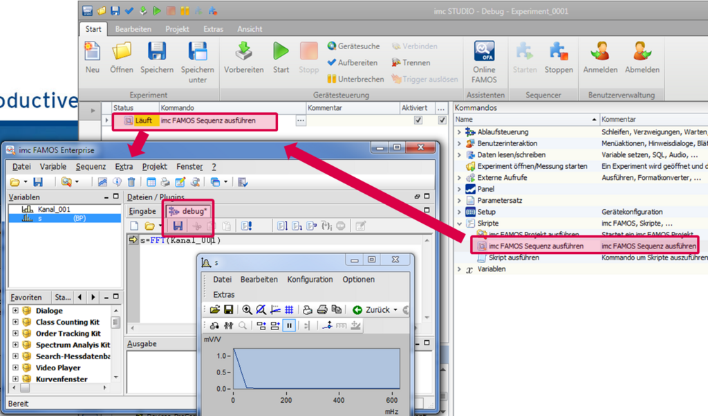 The idea of integrating imc FAMOS to automate data analysis through sequences has been enhanced: by means of the new “Debug-Mode” it is possible to run these sequences step-by-step, directly with the latest measurement data. This means all interim results are available for processing and viewing, which in turn makes it significantly easier to review and develop analysis algorithms.